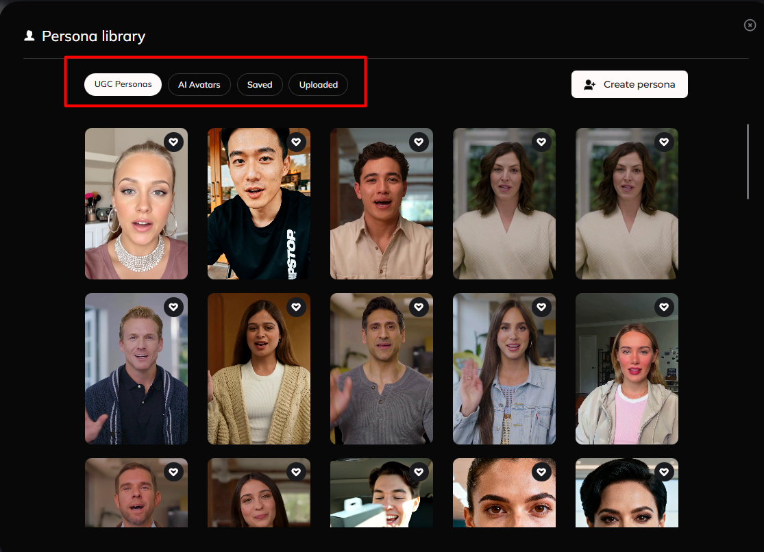 - In the Persona Library section, you can select the persona you want to use either it's a Persona from your UGC Videos, from AI Avatars, from Saved Videos or from your Uploaded personas.
