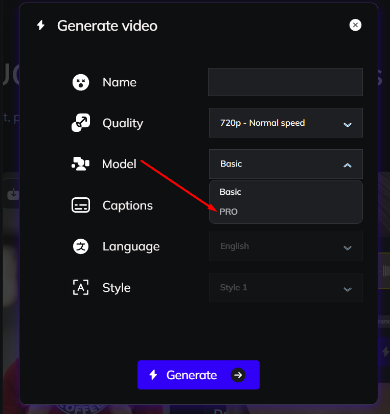 The PRO model is an enhanced option within UGC that offers higher-quality output for both Still and Motion personas. It's a more advanced model that users can choose for improved performance and results.