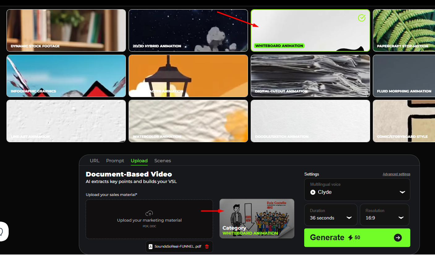 At the top, you select a video animation style for your VSL.