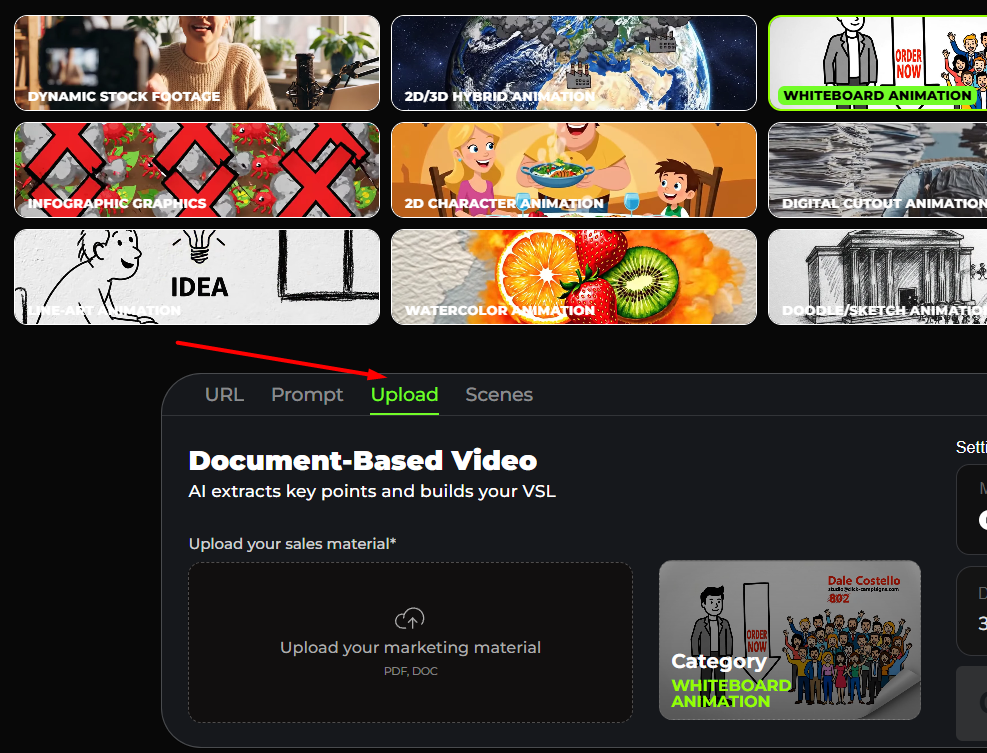 The preview box labeled Category shows the selected style again β in this case: WHITEBOARD ANIMATION