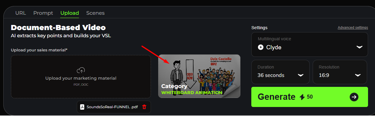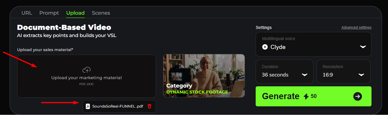 Upload your sales material in PDF or DOC format, and the system will automatically extract the key points, write the script, and build your video.