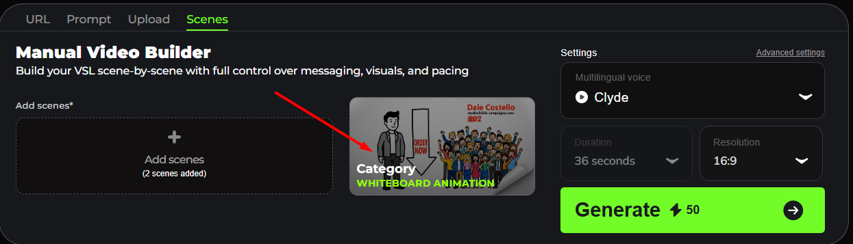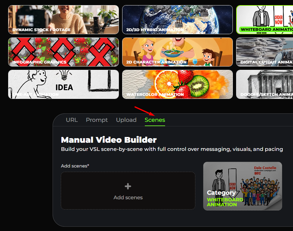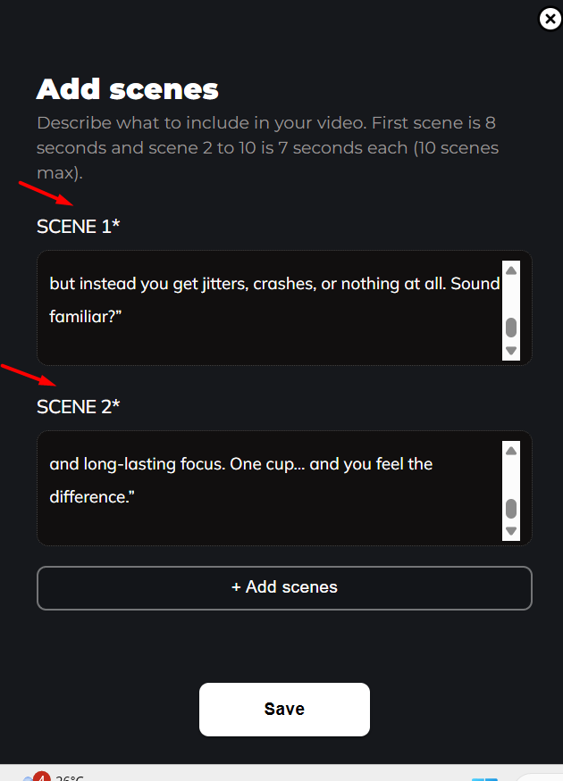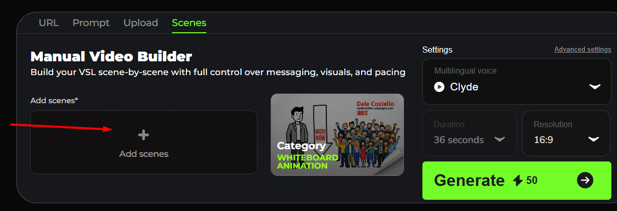 This is the Add Scenes window, where you manually enter the scenes that will appear in your VSL. This tool lets you describe each scene so the AI can generate visuals based on what you write.