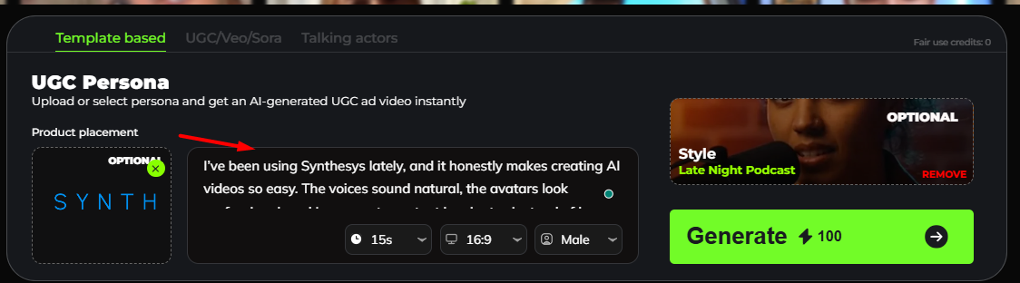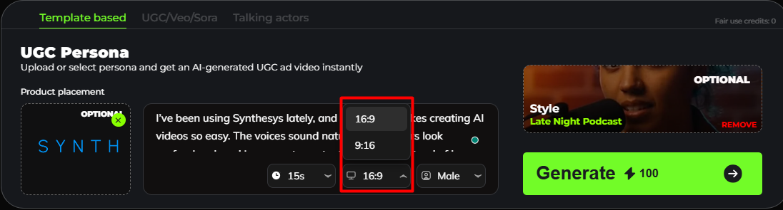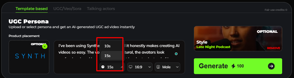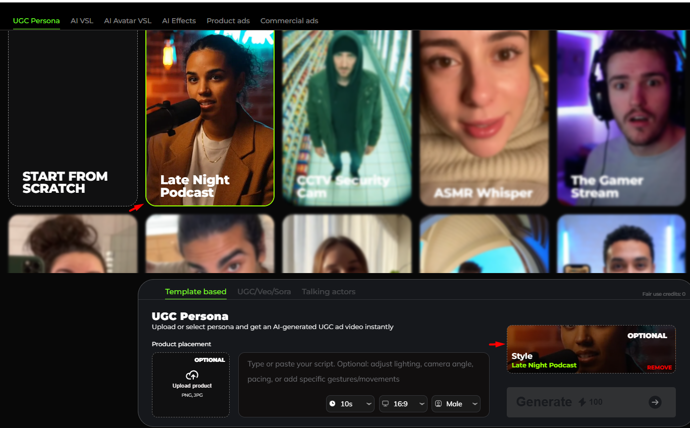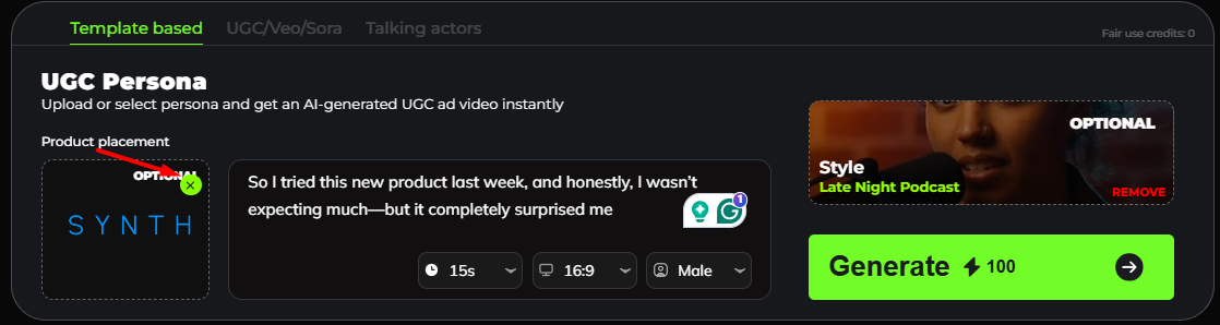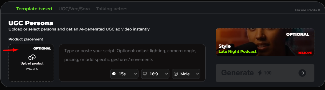 UGC Template-Based allows you to quickly create user-generated style videos using ready-made templates. Simply choose a template, customize the text or visuals, and generate engaging content without starting from scratch. This option is ideal for fast production, consistent branding, and creating UGC videos with minimal setup.