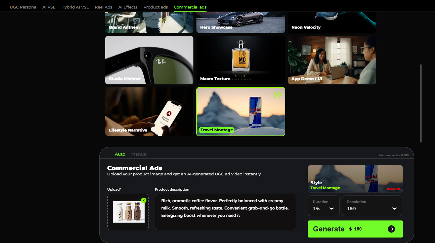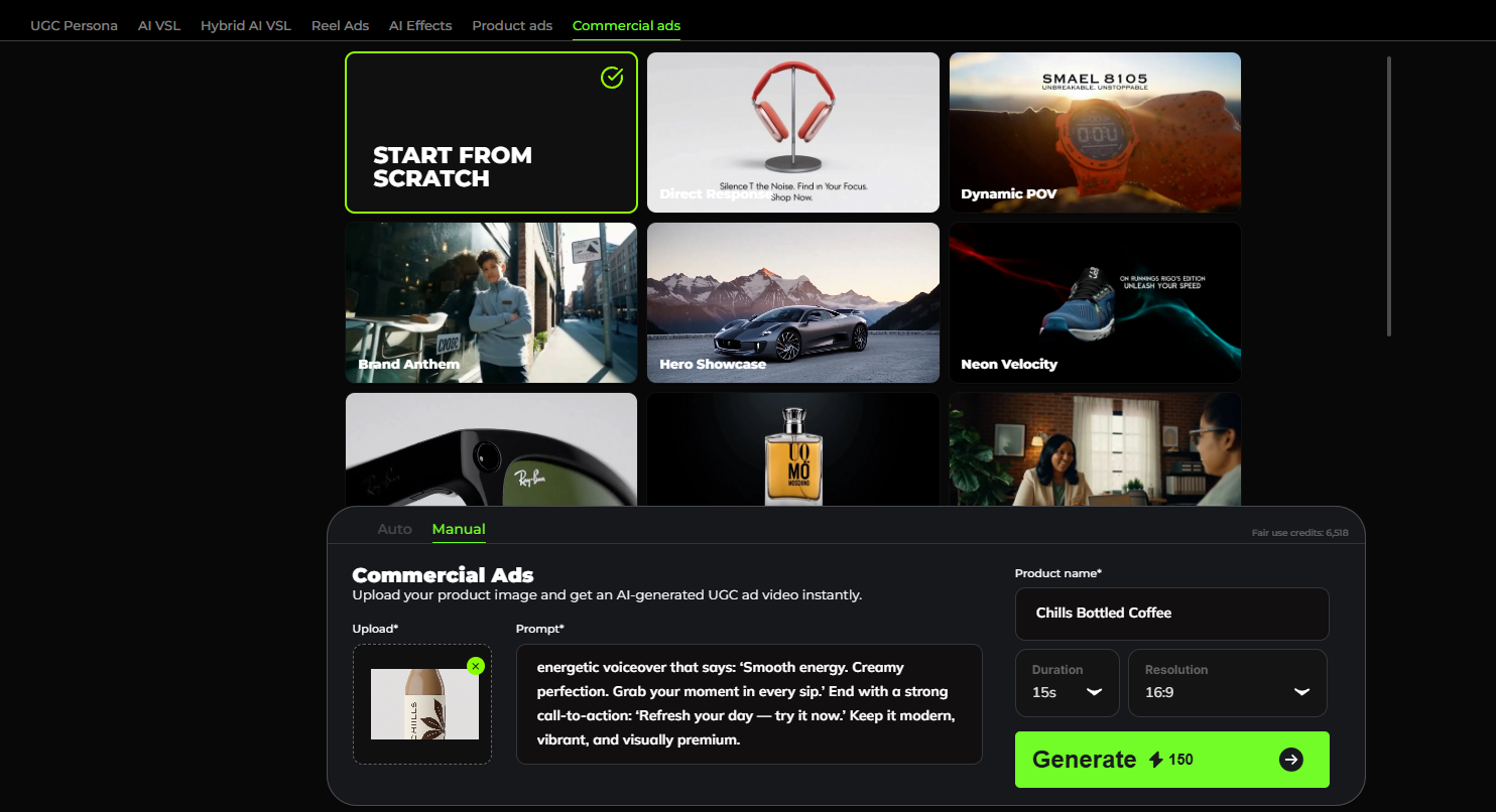 Commercial Ads are cinematic, broadcast-quality advertisements. The format delivers professional TV and YouTube commercial style without needing a production crew. These videos are best for premium brand campaigns, TV placement, YouTube pre-roll, and major launches. The key feature is Hollywood-level production value at a fraction of the cost.