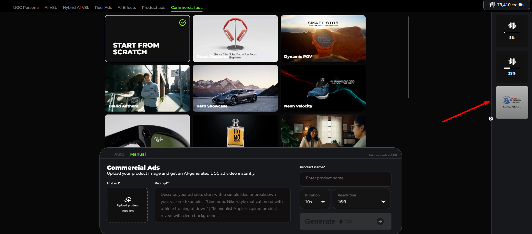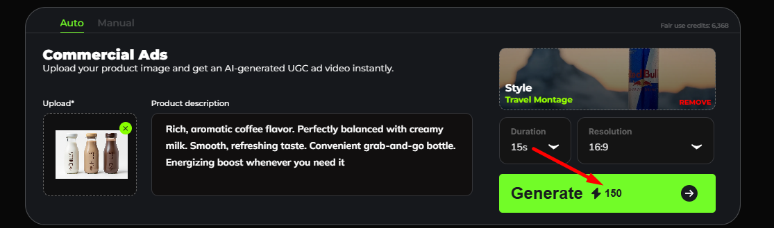 - Add your prompt by describing your ad idea. Example: "Cinematic Nike-style motivation ad with athlete training at dawn" or "Minimalist Apple-inspired product reveal with clean backgrounds"