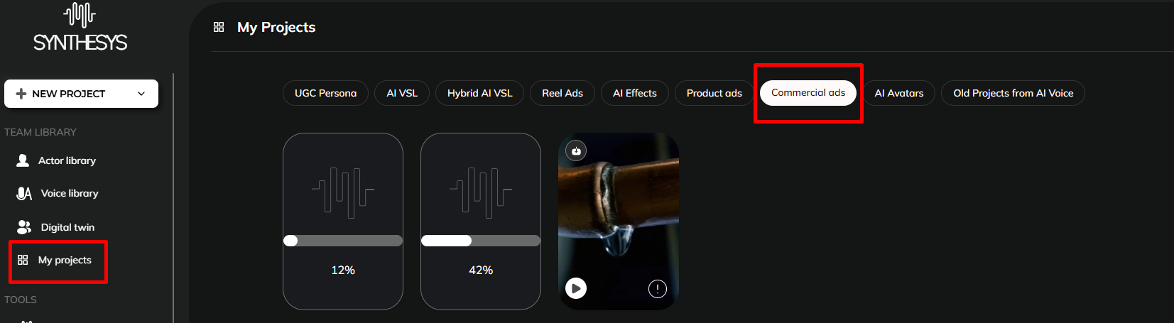 You can view your Commercial Ads either on the right side of the Commercial Ads dashboard or in "My Projects" tab